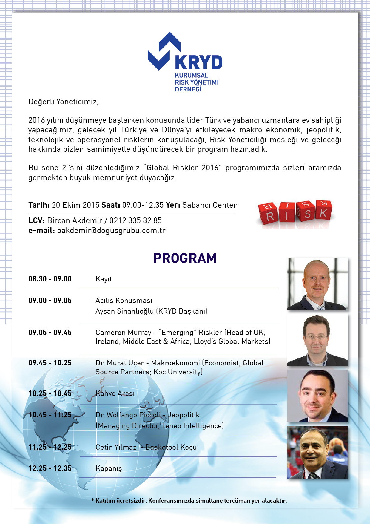 Kurumsal Risk Yönetim Derneği tarafından bu sene 2.si düzenlenen “Global Riskler 2016” semineri 20 Ekim 2015 tarihinde Sabancı Center’da düzenleniyor. 09:00-12:30 saatleri arasında düzenlenecek etkinliğe katılım ücretsiz olacak.