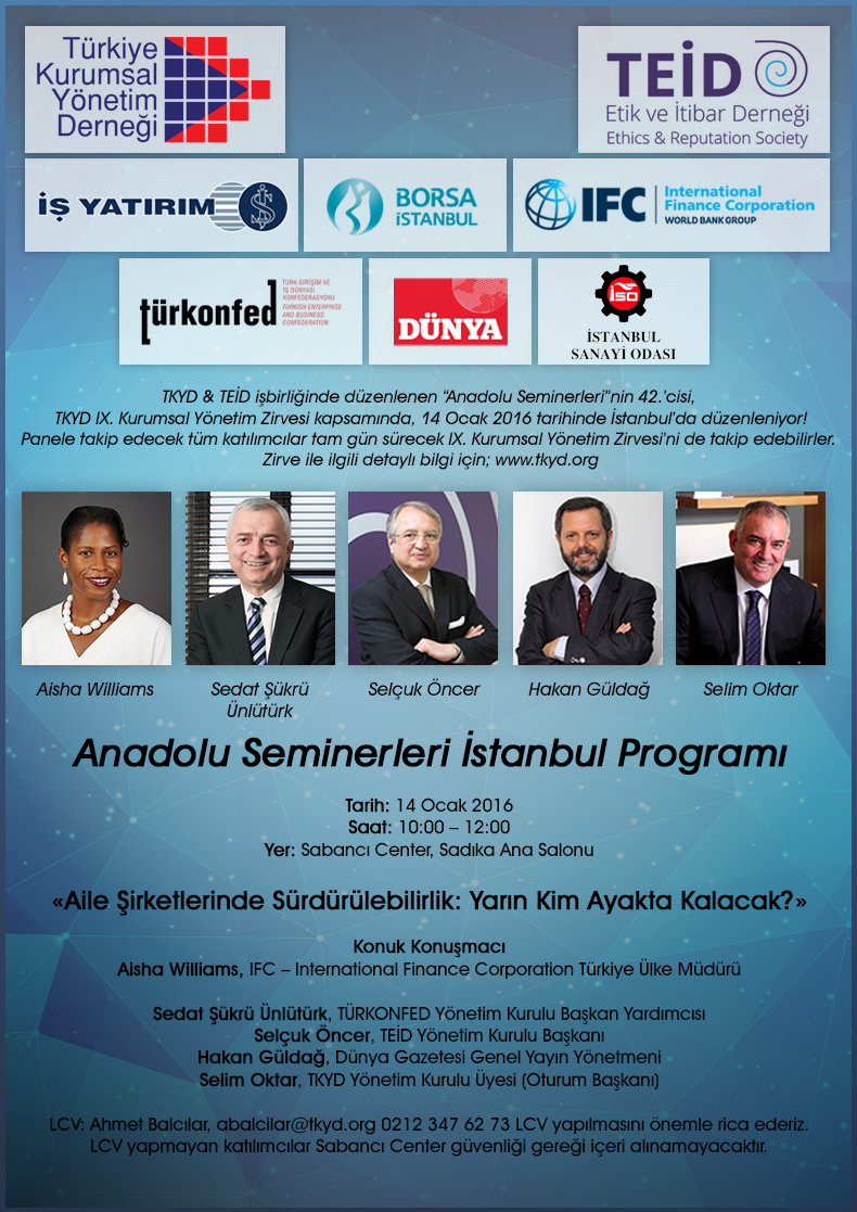 TKYD & TEİD işbirliğinde düzenlenen Anadolu Seminerleri’nin 42.cisi IX. Kurumsal Yönetim Zirvesi kapsamında 14 Ocak 2016 tarihinde Sabancı Center’da gerçekleşti.