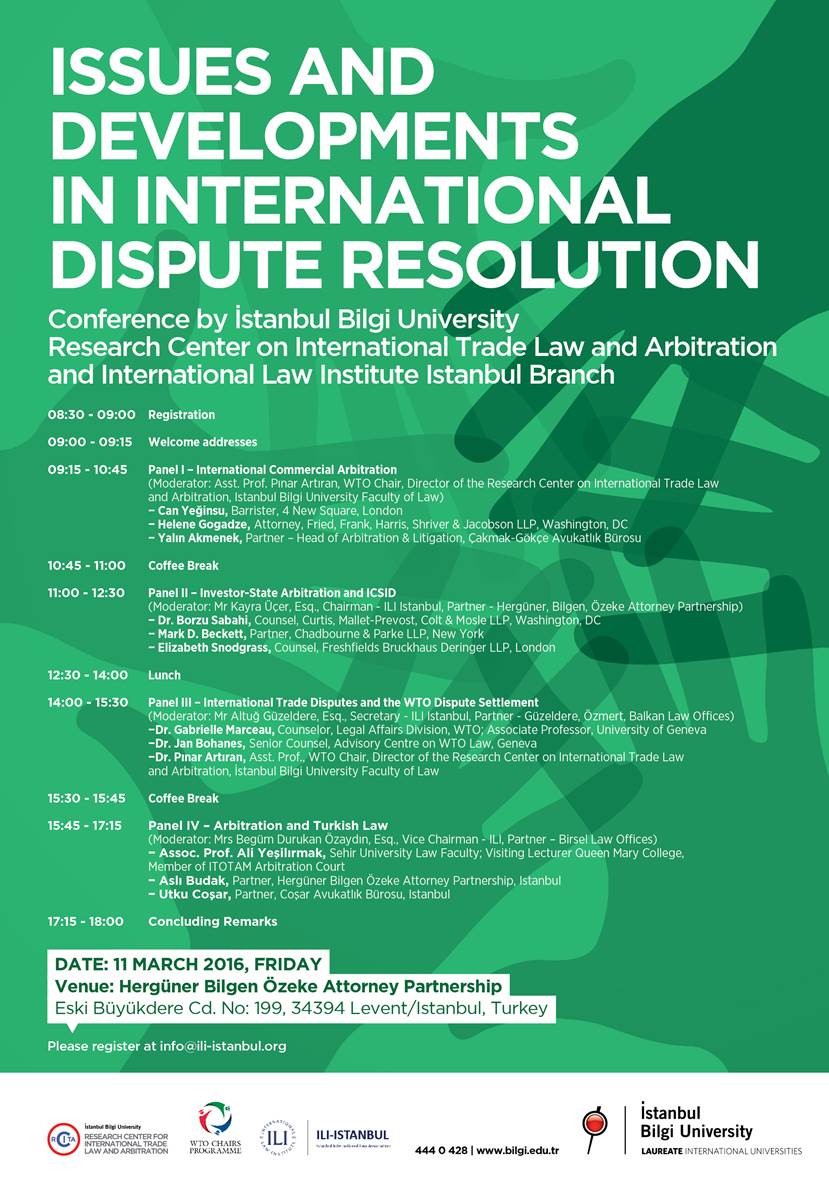 International Law Institute (ILI) ve İstanbul Bilgi Üniversitesi Uluslararası Ticaret Hukuku ve Tahkim Araştırma Merkezi tarafından 11 Mart 2016 tarihinde, Hergüner Bilgen Özeke Avukatlık Ortaklığı adresinde uluslararası uyuşmazlıkların çözümü üzerine bir konferans düzenlenecektir.