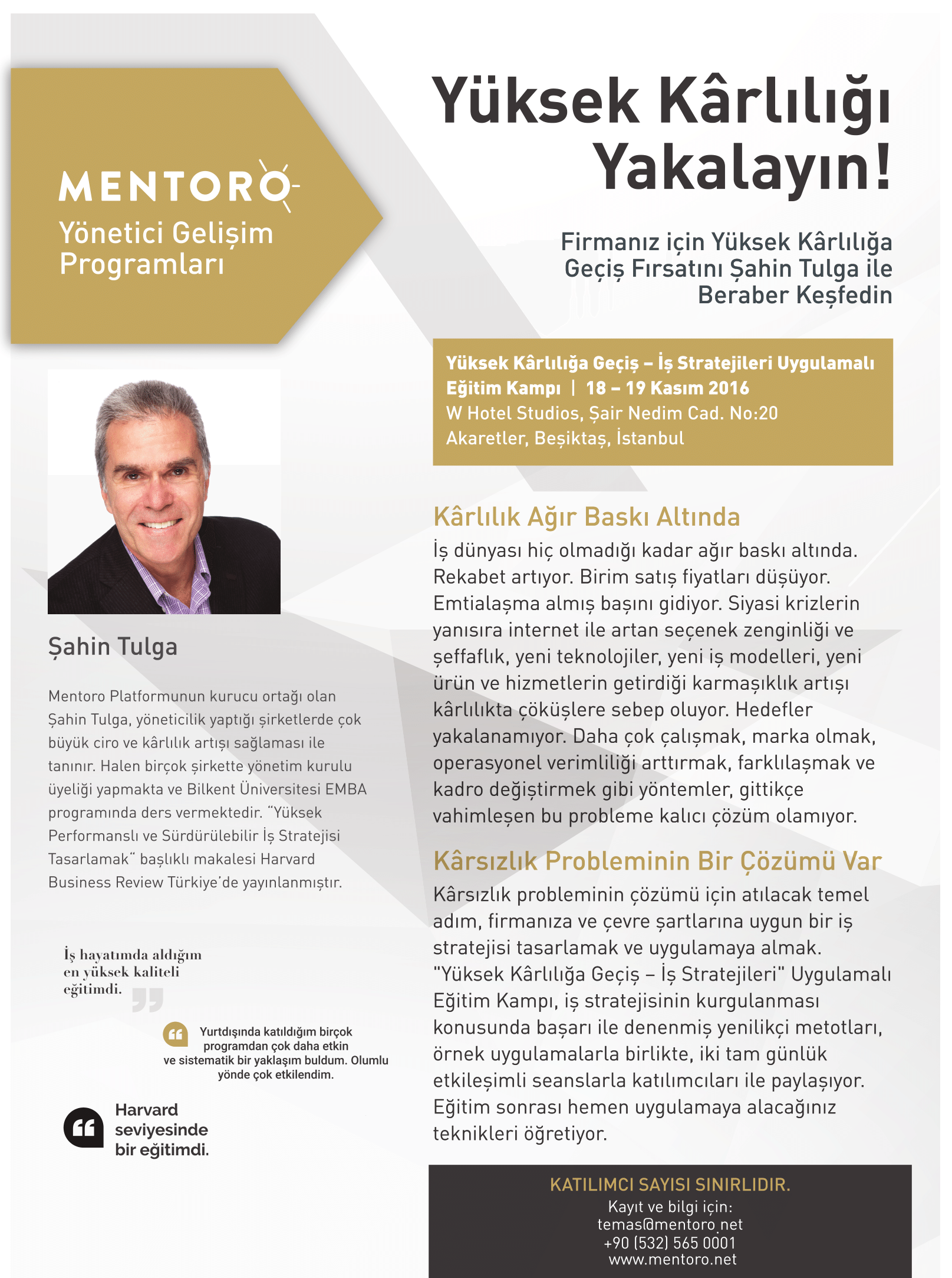 Yüksek Kârlılığa Geçiş – İş Stratejileri Eğitimi Şahin Tulga tarafından 18 – 19 Kasım 2016 tarihinde W Hotel Studios’ta düzenlenecek.
