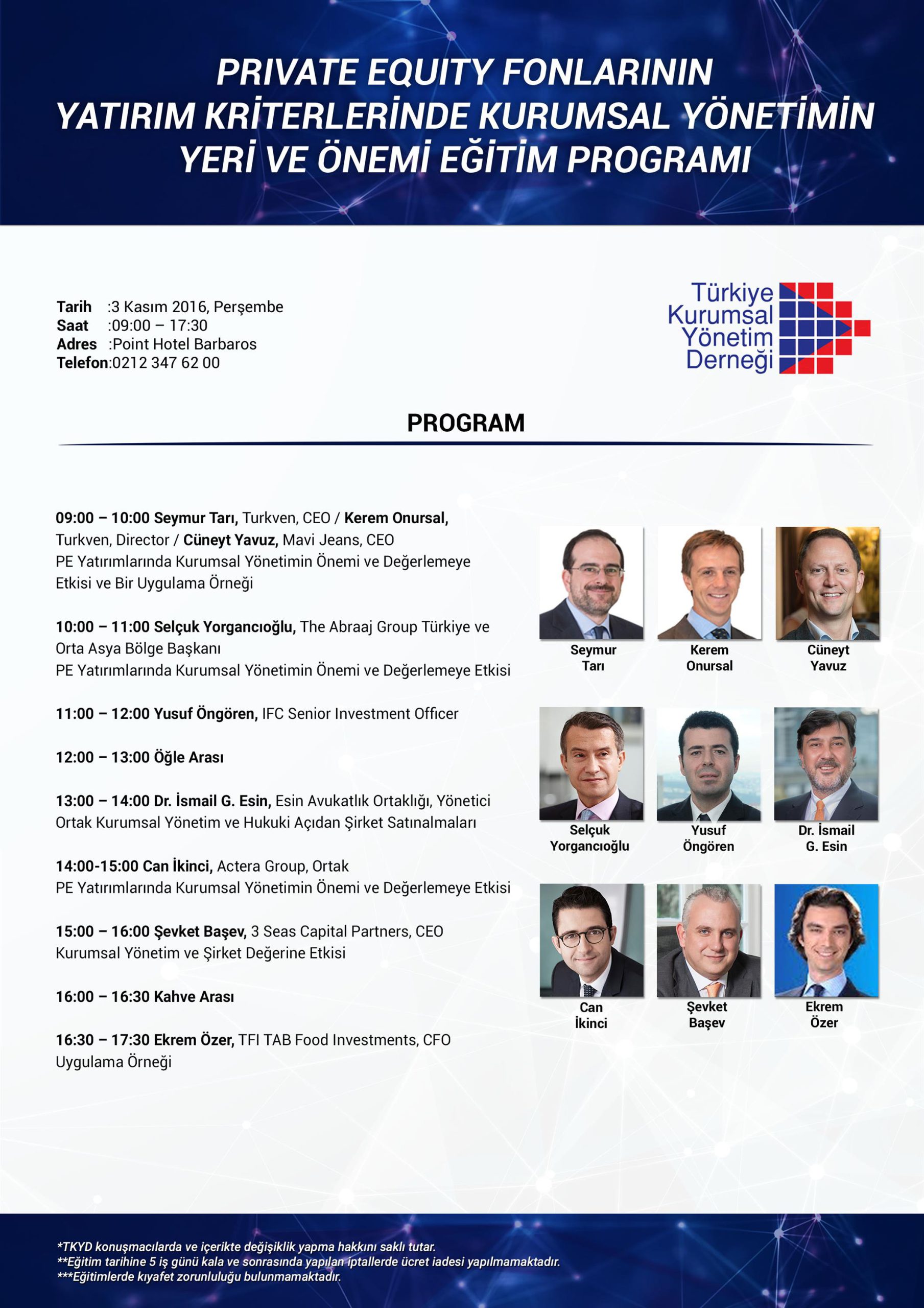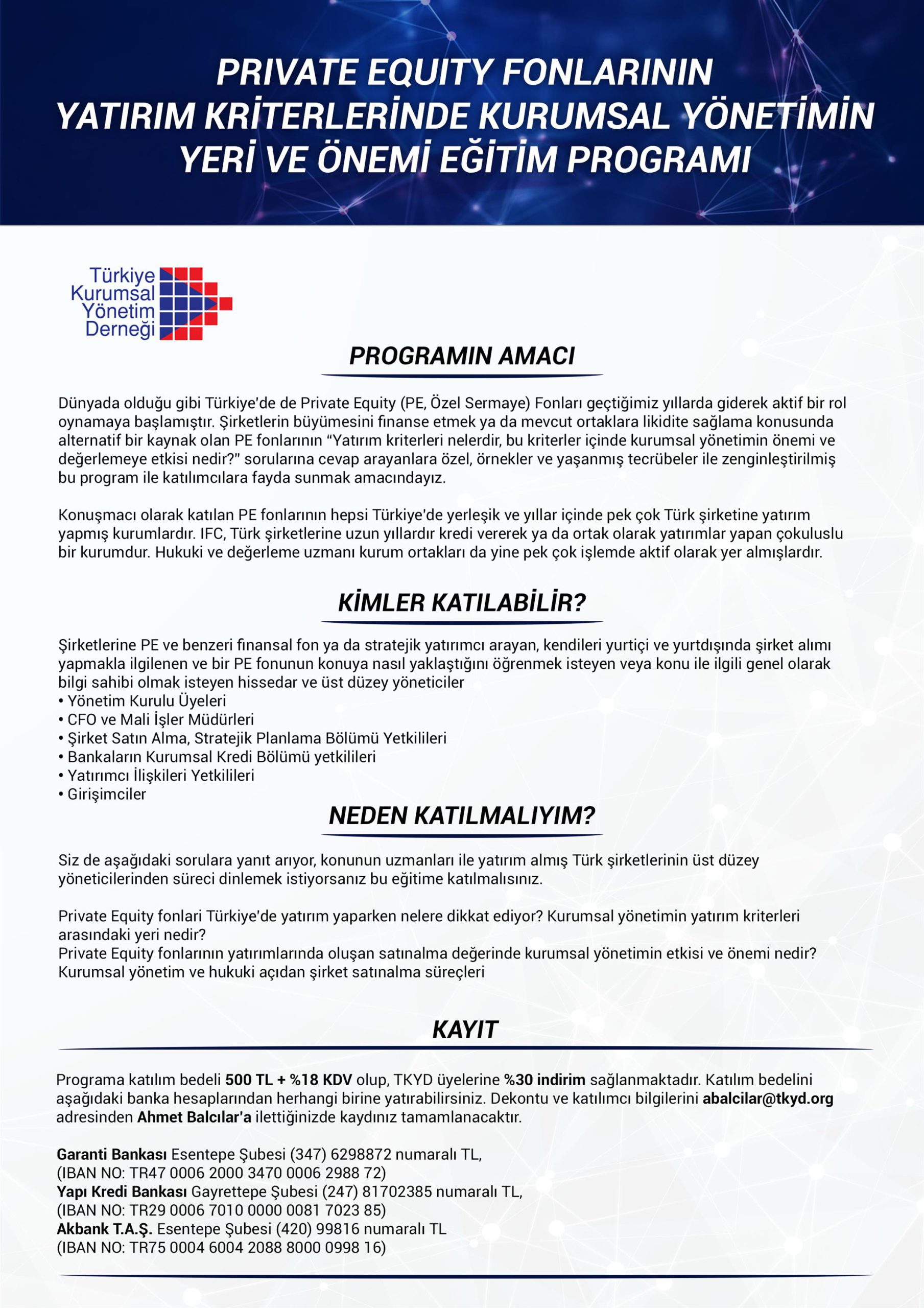 Dünyada olduğu gibi Türkiye’de de Private Equity (PE, Özel Sermaye) Fonları geçtiğimiz yıllarda giderek aktif bir rol oynamaya başladı. Şirketlerin büyümesini finanse etmek ya da mevcut ortaklara likidite sağlama konusunda alternatif bir kaynak olan PE fonlarının “Yatırım kriterleri nelerdir, bu kriterler içinde kurumsal yönetimin önemi ve değerlemeye etkisi nedir?” sorularına cevap arayanlara özel, örnekler ve yaşanmış tecrübeler ile zenginleştirilmiş bu programa katılmak için bizimle iletişime geçebilirsiniz. egitim@tkyd.org, 0212 347 62 00