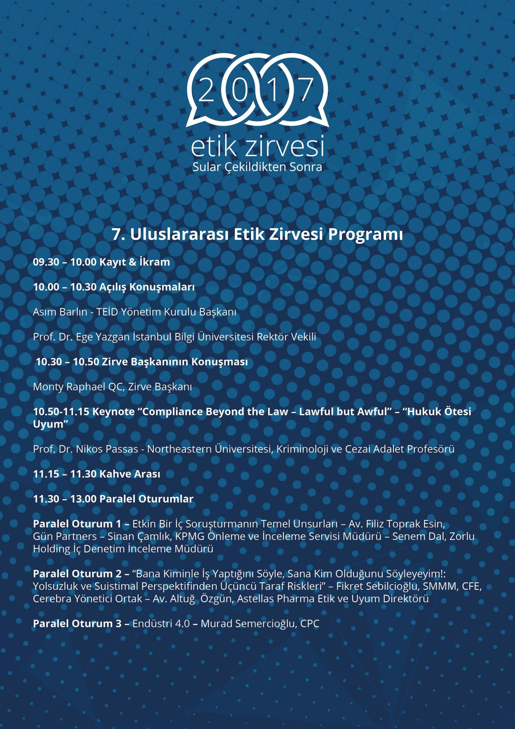 Bu sene, Uluslararası Etik Zirvesi’nin 7. yılında, dünyaca ünlü şirketlerin yaşadıkları etik krizlerin ardından, normal hayat akışına dönerken yapılması gerekenler, iş dünyasının tecrübeli yöneticileri eşliğinde bulunmaya çalışılacak. Etik krizlerin verdiği hasarın tekrarlanmamasına yönelik çalışmaların yanı sıra, potansiyel bir suistimalcinin, “fırtınayı çıkaran adam”ın profiline, kriz sonrasında liderlerin ve üst düzey yöneticilerin bu süreci yönetirken göz önünde bulundurmaları gereken hususlara değinilecek. Kriz sonrasında, şirket etik politikalarının gözden geçirilmesini, her şey normale dönerken iletişim ve itibar yönetiminin nasıl olması gerektiği örnekleriyle beraber incelenip, uyumun her alanda hâkim olduğu bir iş dünyasının nasıl hayata geçebileceği tartışılacak.