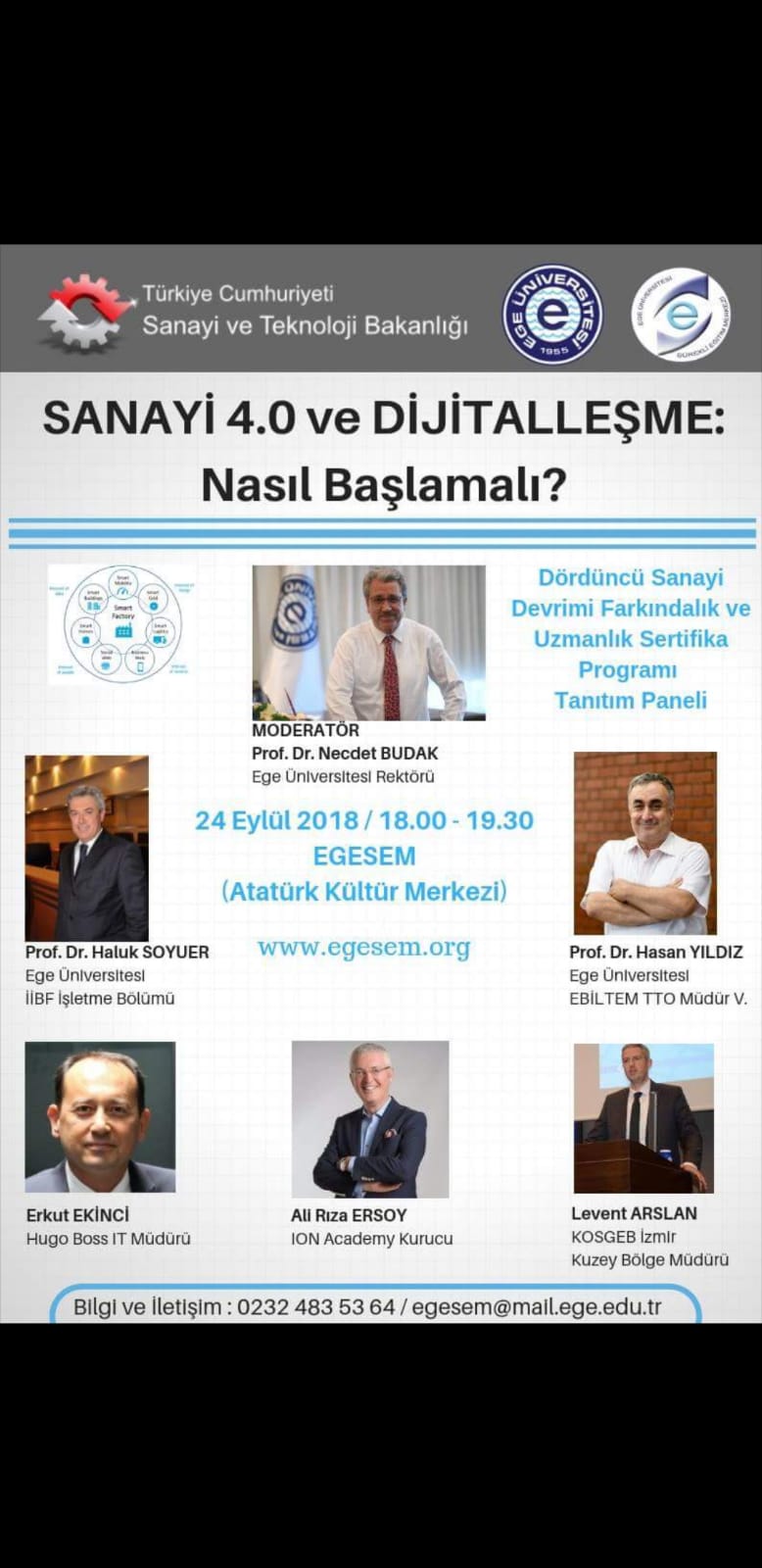 Ege Üniversitesi Sürekli Eğitim Merkezi (EGESEM) tarafından 24 Eylül 2018 Pazartesi günü Konak Atütürk Kültür Merkezi EGESEM Konferans Salonu’nda Ege Üniversitesi Rektörü Prof. Dr. Necdet Budak moderatörlüğünde “Sanayi 4.0 ve Dijitalleşme: Nasıl Başlamalı?” Paneli düzenlenecektir. Panele katılım ücretsizdir.