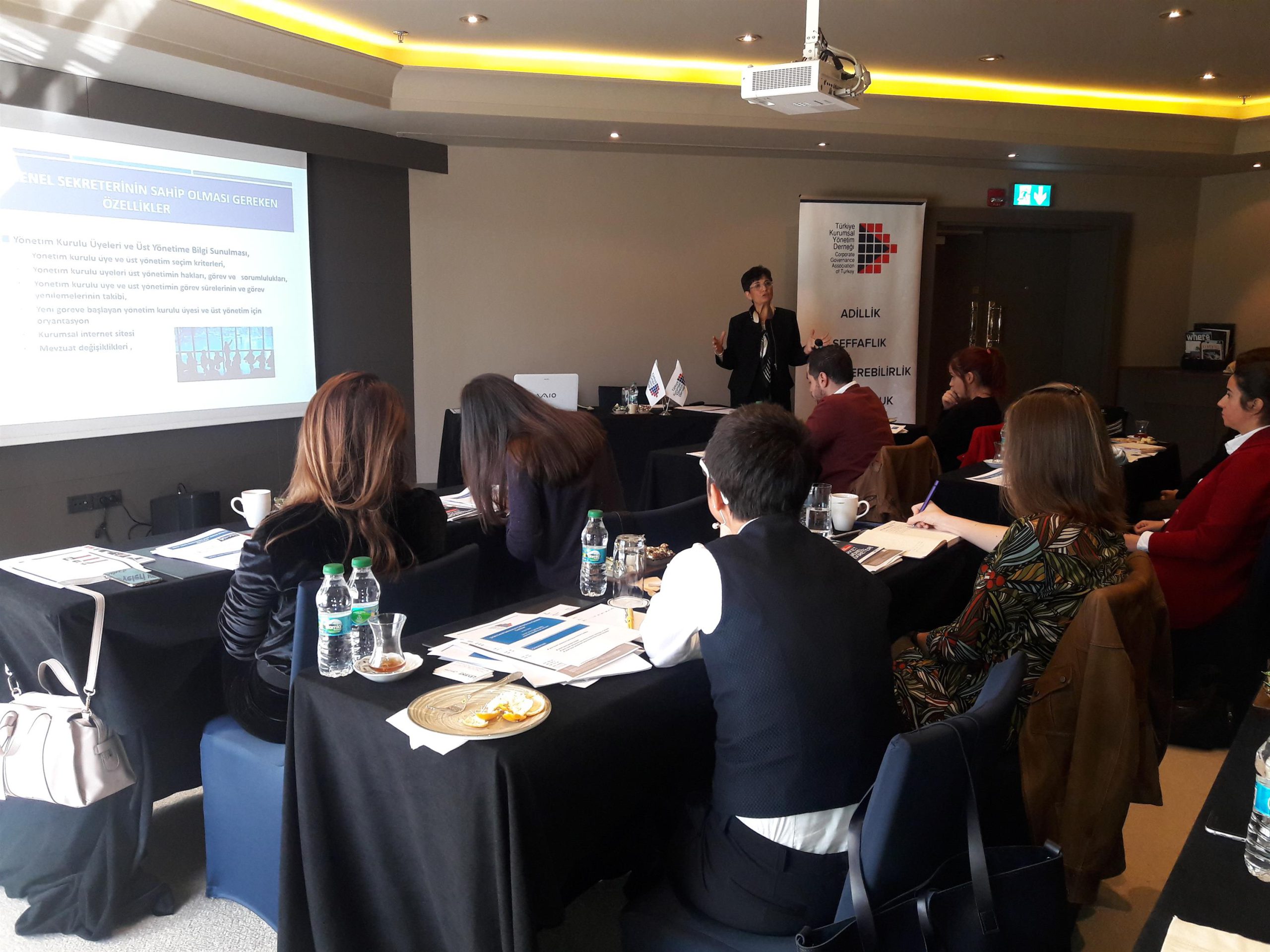 Şirket Genel Sekreteri eğitimi 25 Ekim 2018 tarihinde Intercontinental Otel’de düzenlendi. Eğitimin konuşmacıları; TKYD Yönetim Kurulu Üyesi ve Ümit Yayla Avukatlık Bürosu Yönetici Ortağı Av. Ümit Yayla, TKYD Üyesi ve Kurum Artı Yönetici Ortağı Arzu Çakmakçıoğlu ve TKYD Üyesi-Şişecem Genel Müdür Danışmanı Nihal Mashaki oldu. Eğitimde; şirket genel sekterinin kurumsal yönetim çerçevesinde yeri ve şirket içindeki önemi, görev ve sorumlulukları, sahip olması gereken özellikler ve  yetkinlikler, genel kurul ve yönetim kurulu toplantılarındaki görev ve sorumlulukları detaylı olarak ele alındı.