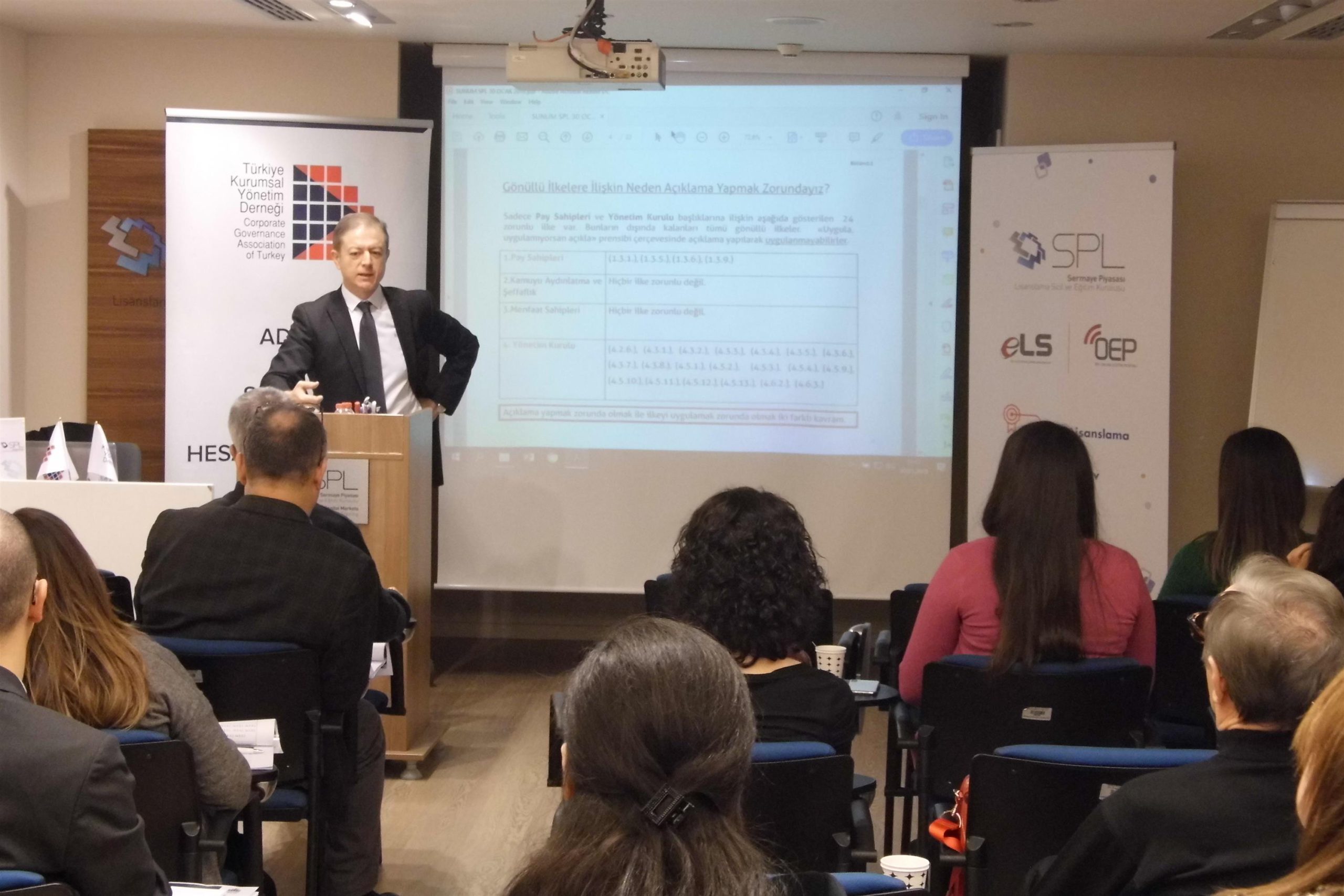 Kurumsal Yönetim Uyum Raporu ve Şirket Faaliyet Raporlarının Hazırlanması eğitimi 22 Ocak 2019 tarihinde SPL Genel Merkez’de SPL&TKYD işbirliğinde düzenlendi. Av. Ümit Yayla; SPK’nın 10.01.2019 tarihli karar ve 2/49 sayılı ilke kararı uyarınca hazırlanacak Kurumsal Yönetim Uyum Raporu ve Kurumsal Yönetim Bilgi Formu konusunda katılımcıları detayları olarak bilgilendirdi. Eğitimin ikinci bölümünde faaliyet raporlarının hazırlanması, TTK’ya tabi şirketler için SPKn’a tabi şirketler için uyulması gereken zorunluluklara değiniildi, uygulamada karşılaşılan sorunlar tartışıldı.