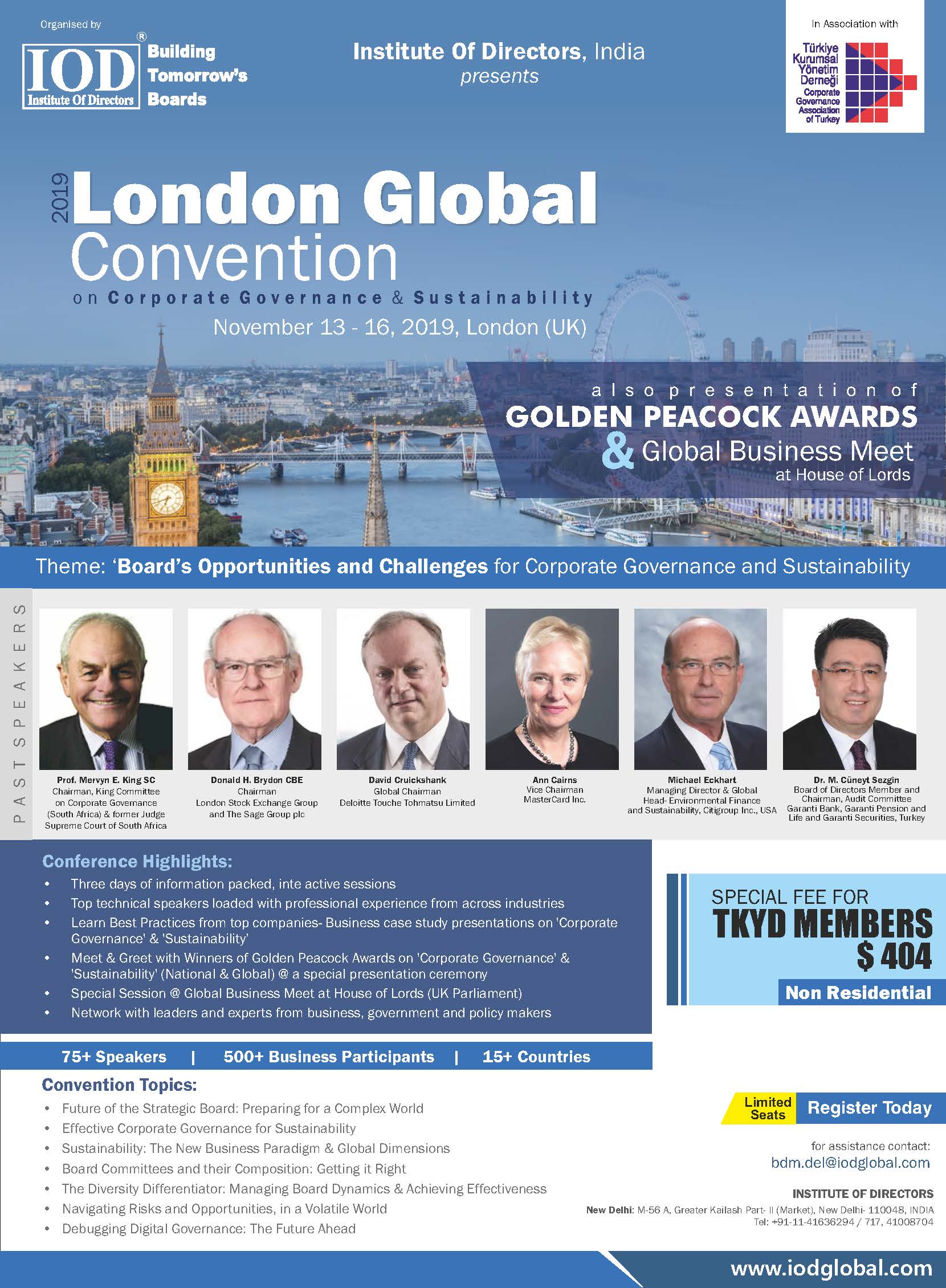 IoD India tarafından “2019 London Global Convention” 13-16 Kasım 2019 tarihleri arasında Londra’da düzenlenecek. TKYD üyelerinin %20 indirimli katılabileceği organizasyonun detaylarına buradan ulaşabilirsiniz.