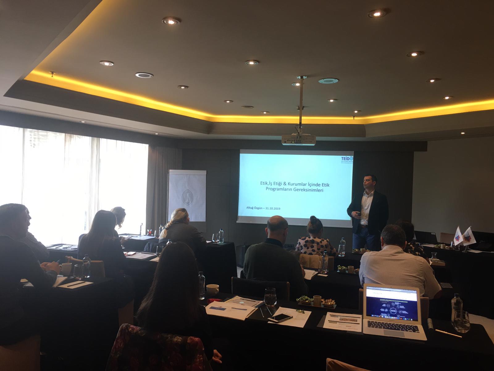 Eğitim, Etik ve İtibar Derneği (TEİD) işbirliğinde 31 Ekim 2019 tarihinde Intercontinental Otel’de düzenlendi. Eğitimin konuşmacıları TKYD Yönetim Kurulu Üyesi ve Şişecam Genel Müdür Danışmanı Av. Nihal Mashaki ve TEİD Yönetim Kurulu Üyesi, Atellas Pharma Etik ve Uyum Koordinatörü Av. Kemal Altuğ Özgün oldu. Etik nedir, iş etiği, kurumlarda etik ve uyum kurallarının gereksinimleri, uluslararası mevzuatta etik, uyum fonksiyonlarının Türkiye’deki yeri, global şirketlerde yapı, uyumdan beklenen faydalar ve oluşturulması önerilen yapılar kurumsal yönetim çerçevesinde ele alındı.