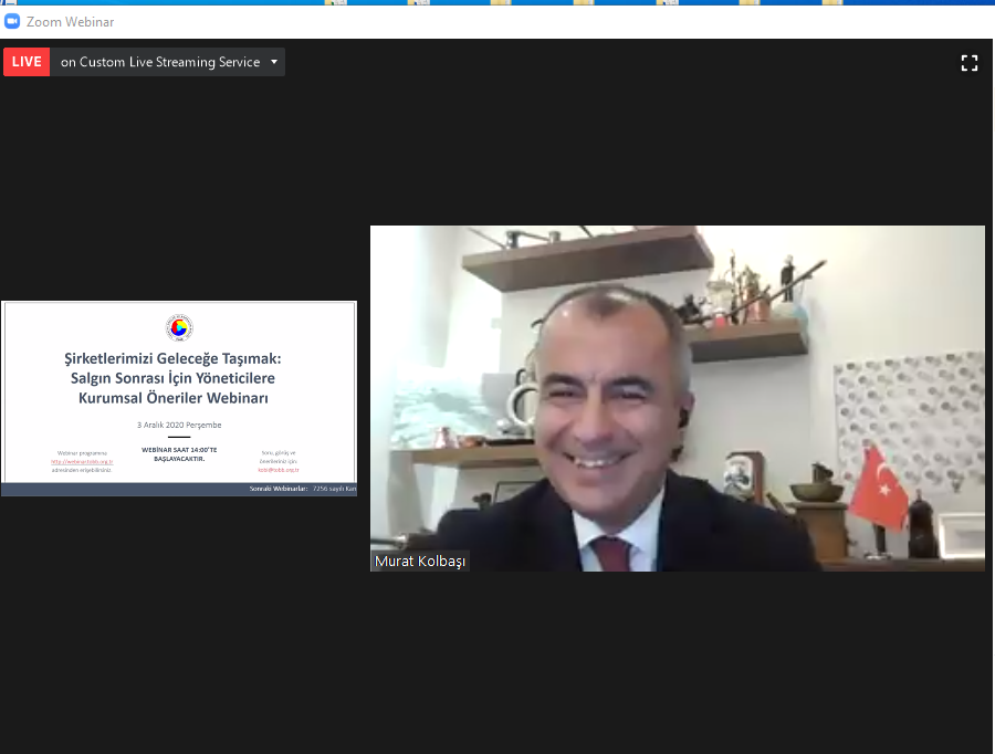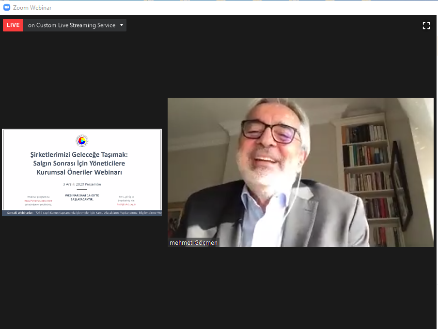 Şirketlerimizi Geleceğe Taşımak: Salgın Sonrası İçin Yöneticilere Kurumsal Öneriler webinarı, Türkiye Odalar ve Borsalar Birliği ve Türkiye Kurumsal Yönetim Derneği iş birliğinde 3 Aralık 2020 tarihinde çevrim içi olarak düzenlendi. Moderatörlüğünü TKYD Danışma Kurulu Üyesi Mehmet Göçmen ‘in yaptığı etkinlikte Yaşar Holding Yönetim Kurulu Başkan Vekili ve Pınar Süt Yönetim Kurulu Başkanı İdil Yiğitbaşı ile Arzum Küçük Ev Aletleri Yönetim Kurulu Başkanı Murat Kolbaşı değerli tecrübelerini paylaştı.