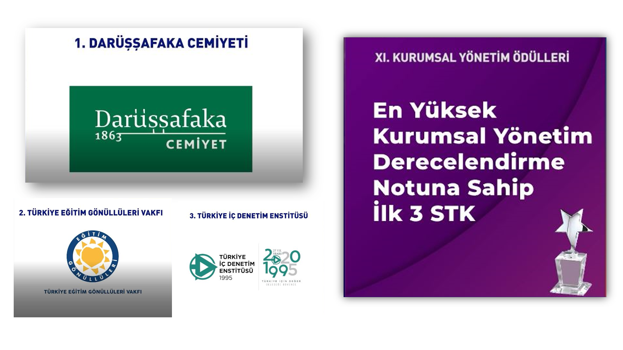 “En Yüksek Kurumsal Yönetim Derecelendirme Notuna Sahip İlk 3 STK” kategorisinin zirvesinde ise Darüşşafaka Cemiyeti yer aldı. Türkiye Eğitim Gönüllüleri Vakfı ikinci sırayı elde ederken, onu Türkiye İç Denetim Enstitüsü izledi.