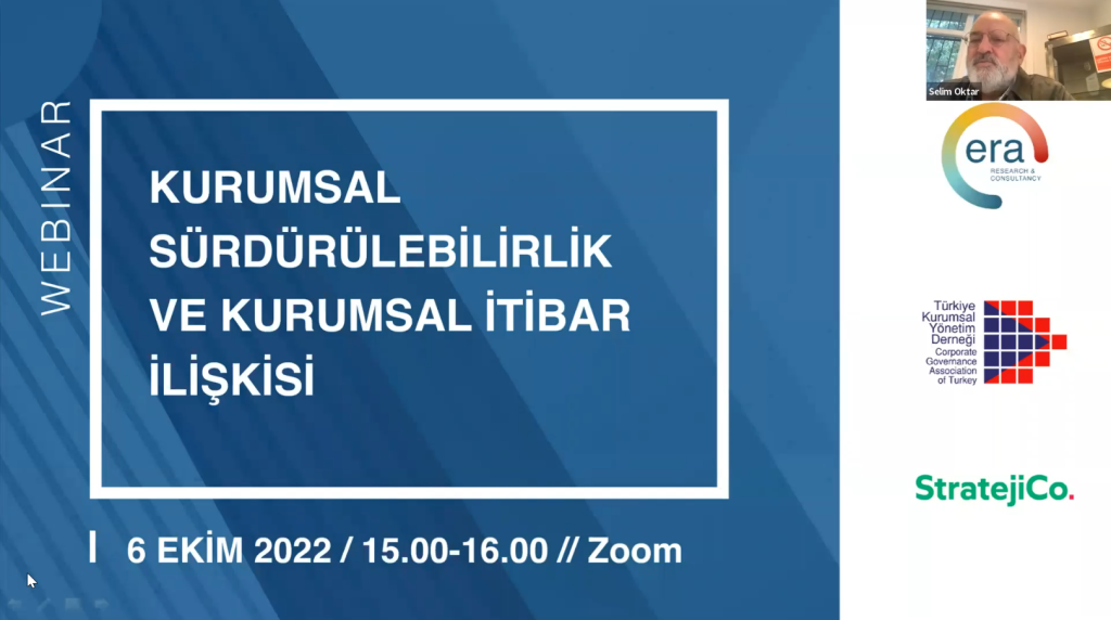 “Kurumsal Sürdürülebilirlik ve Kurumsal İtibar İlişkisi” başlıklı webinar 6 Ekim 2022 tarihinde TKYD ve ERA Research & Consultancy iş birliğinde düzenlendi.