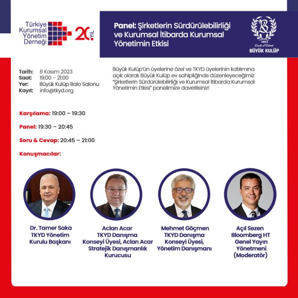 Büyük Kulüp’ün üyelerine özel ve TKYD üyelerinin katılımına açık olarak Büyük Kulüp ev sahipliğinde düzenleyeceğimiz, TKYD Yönetim Kurulu Başkanı Dr. Tamer Saka, TKYD Danışma Konseyi Üyesi, Aclan Acar Stratejik Danışmanlık Kurucusu Aclan Acar, TKYD Danışma Konseyi Üyesi, Yönetim Danışmanı Mehmet Göçmen’in panelist olarak katılacağı ve Bloomberg HT Genel Yayın Yönetmeni Açıl Sezen’in moderasyonunu yapacağı “Şirketlerin Sürdürülebilirliği ve Kurumsal İtibarda Kurumsal Yönetimin Etkisi” panelimize tüm üyelerimiz davetlidir!