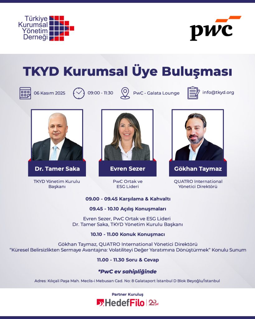 Türkiye Kurumsal Yönetim Derneği (TKYD) tarafından PwC ev sahipliğinde düzenlenecek Kurumsal Üye Buluşması, 6 Kasım 2025 tarihinde 09.00 – 11.30 saatleri arasında PwC Galata Lounge’da gerçekleştirilecektir.