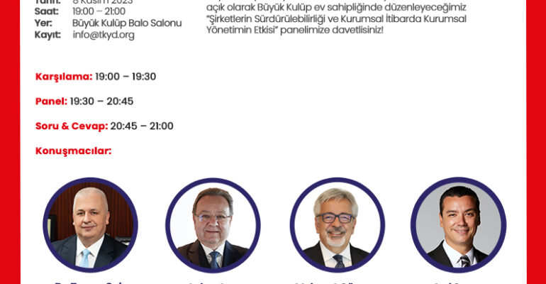 Büyük Kulüp’ün üyelerine özel ve TKYD üyelerinin katılımına açık olarak Büyük Kulüp ev sahipliğinde düzenleyeceğimiz, TKYD Yönetim Kurulu Başkanı Dr. Tamer Saka, TKYD Danışma Konseyi Üyesi, Aclan Acar Stratejik Danışmanlık Kurucusu Aclan Acar, TKYD Danışma Konseyi Üyesi, Yönetim Danışmanı Mehmet Göçmen’in panelist olarak katılacağı ve Bloomberg HT Genel Yayın Yönetmeni Açıl Sezen’in moderasyonunu yapacağı “Şirketlerin Sürdürülebilirliği ve […]