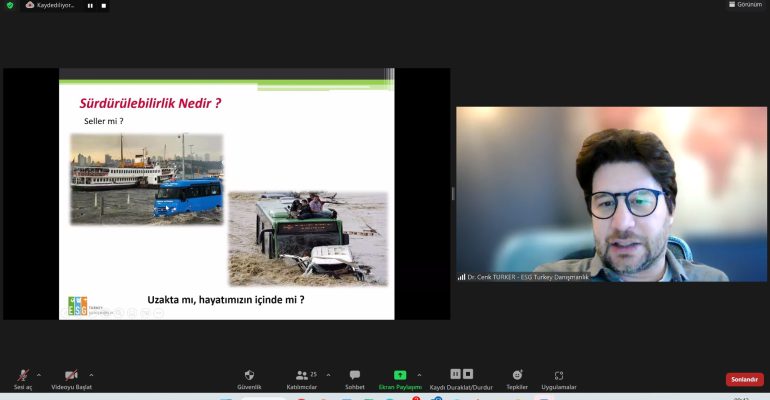 Derneğimizin ESG Çalışma Grubu’nun KOBİ’lerin sürdürülebilirlik konusunda kapasitelerini geliştirmesi amacı ile yürüttüğü proje kapsamında 13 Aralık 2022 tarihinde “Eğitim ve Anket Metodolojisi Anlatımı” için projeye başvuran KOBİ’ler ile çevrim içi ortamda buluştuk. ESG Çalışma Grubu Başkan Yardımcısı Cenk Türker’in verdiği sürdürülebilirlik eğitiminin ardından CGE Evaluation Genel Müdür Yardımcısı Arzu Firid’in anket metodolojisi üzerine proje katılımcılarımızı bilgilendirdi.