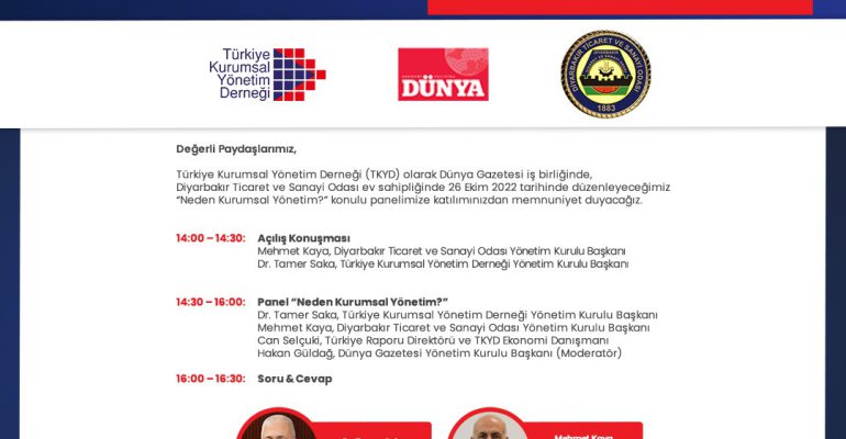 Derneğimizin Dünya Gazetesi iş birliğinde Diyarbakır Ticaret ve Sanayi Odası ev sahipliğinde 26 Ekim 2022 tarihinde düzenleyeceğimiz “Neden Kurumsal Yönetim?” Paneli düzenliyoruz.