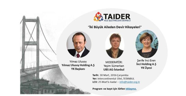 Program: 16.00-17.00 Kayıt ve Çay-Kahve ikramı 17.00-17.15 Açılış 17.15-18.30 Oturum “İki Büyük Aileden Devir Hikayeleri” 18.30-19.00 Soru-Cevap ve Kapanış Yer: Intercontinental Otel, Taksim, İstanbul Konuşmacılar: Yılmaz ULUSOY (Yılmaz Ulusoy Holding Yönetim Kurulu Başkanı) Şerife İNCİ EREN (İnci Holding Yönetim Kurulu Üyesi) Moderatör: Yeşim SÜMERKAN TORAMAN (UBS AG- İstanbul) LCV: 25 Mart’a kadar – info@taider.org.tr · Konaklama ve diğer illerden toplu […]
