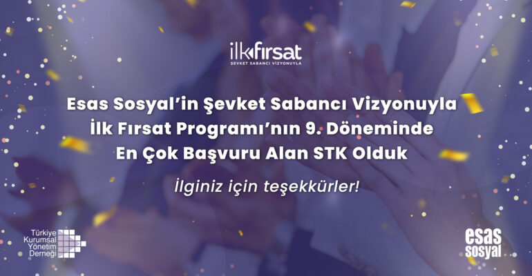 Derneğimiz, Esas Sosyal’in Şevket Sabancı Vizyonuyla İlk Fırsat Programı’nın 9. döneminde en çok başvuruyu alan STK oldu. İki yıldır paydaşlarından biri olduğumuz programda, “İş Geliştirme Uzman Yardımcısı” pozisyonumuza bu yıl toplam 232 başvuru alındı. İlanımıza katılım sağlayan tüm genç arkadaşlarımıza teşekkür ederiz.