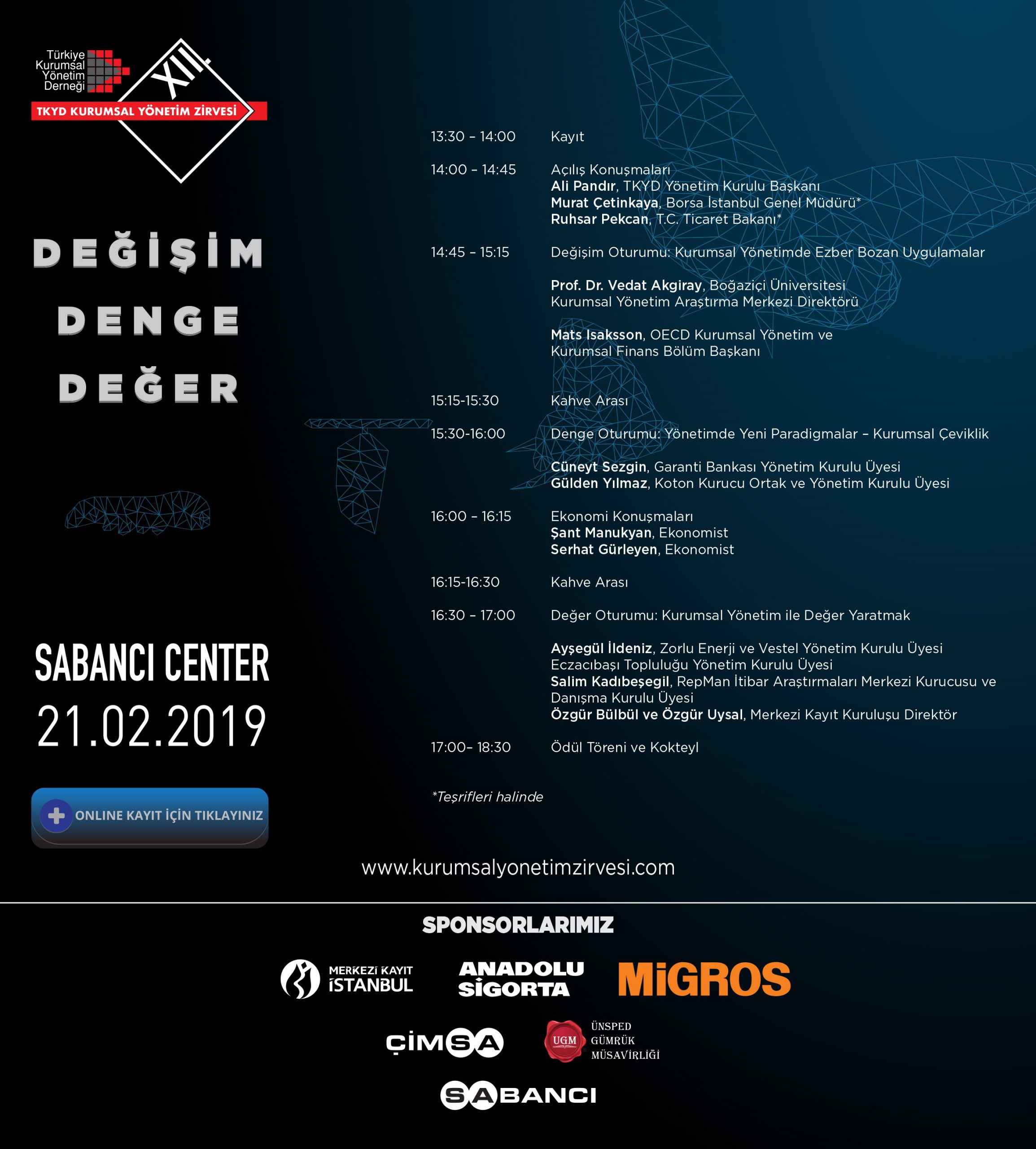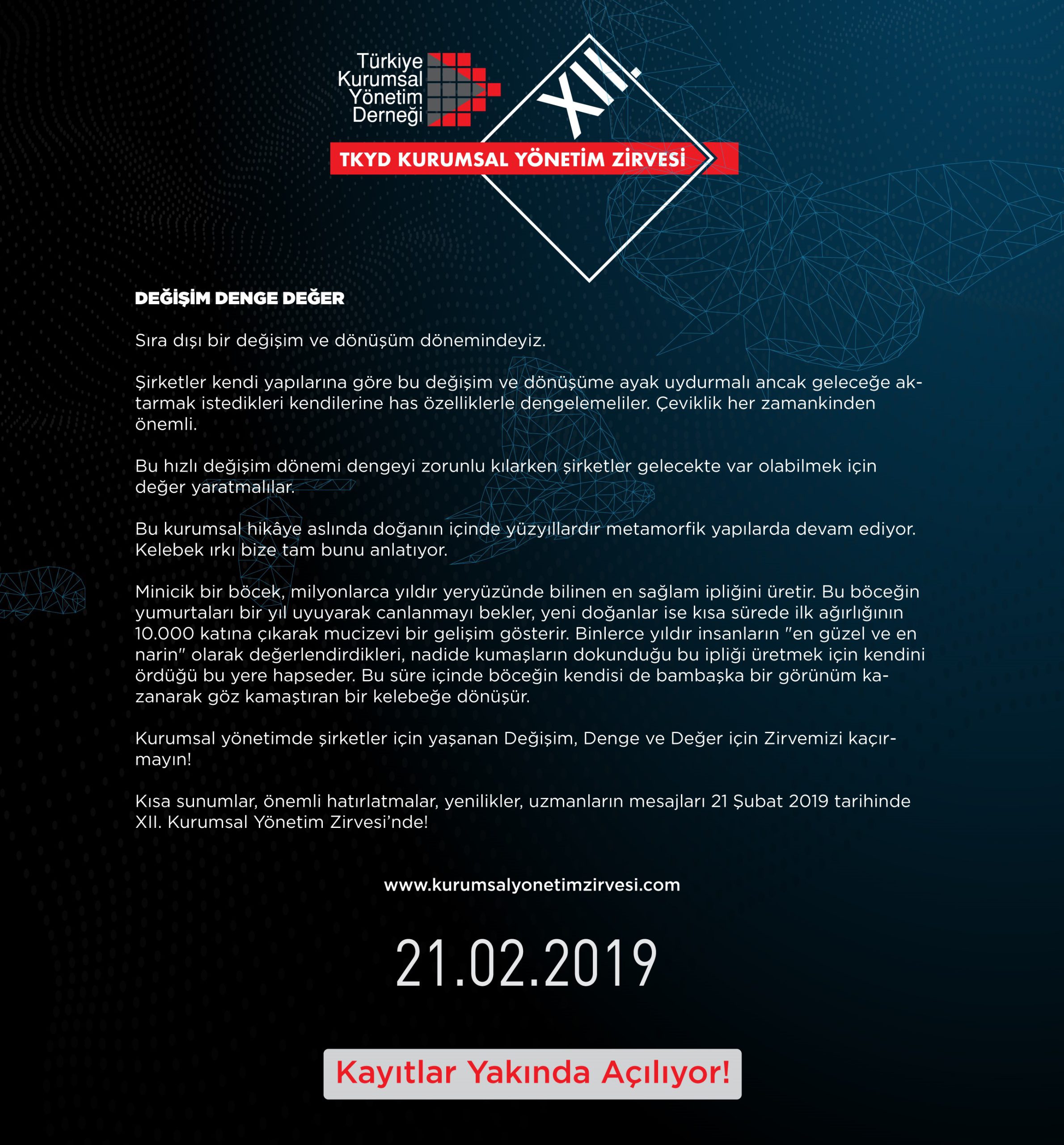 Kurumsal yönetim anlayışının Türkiye’de gelişmesi ve en iyi uygulamalarıyla hayata geçirilmesi amacıyla faaliyetlerini sürdüren Türkiye Kurumsal Yönetim Derneği’nin (TKYD) düzenlediği 12. Kurumsal Yönetim Zirvesi kapsamında verilen ‘Kurumsal Yönetim Ödülleri’, 9’uncu kez sahiplerini buldu. Bu yıl “Kurumsal Yönetim İçin: Değişim-Denge-Değer” ana temasıyla Sabancı Center’da gerçekleştirilen zirvenin ardından düzenlenen ödül töreninde, beş kategoride toplam 7 şirket ve 3 sivil toplum kuruluşuna (STK) ödülleri verildi.