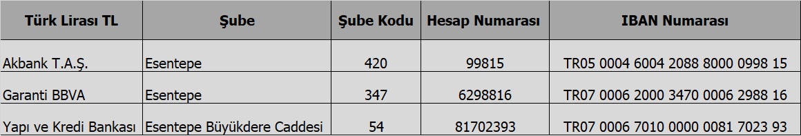 | Türk Lirası TL | Şube | Şube Kodu | Hesap Numarası | IBAN Numarası |