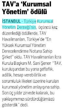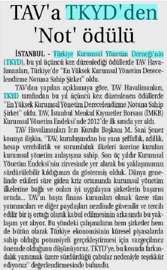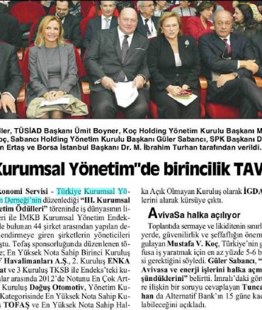 “Kurumsal Yönetim”de Birincilik TAV’ın Cumhuriyet, 16 Ocak 2013