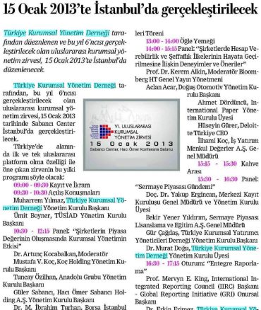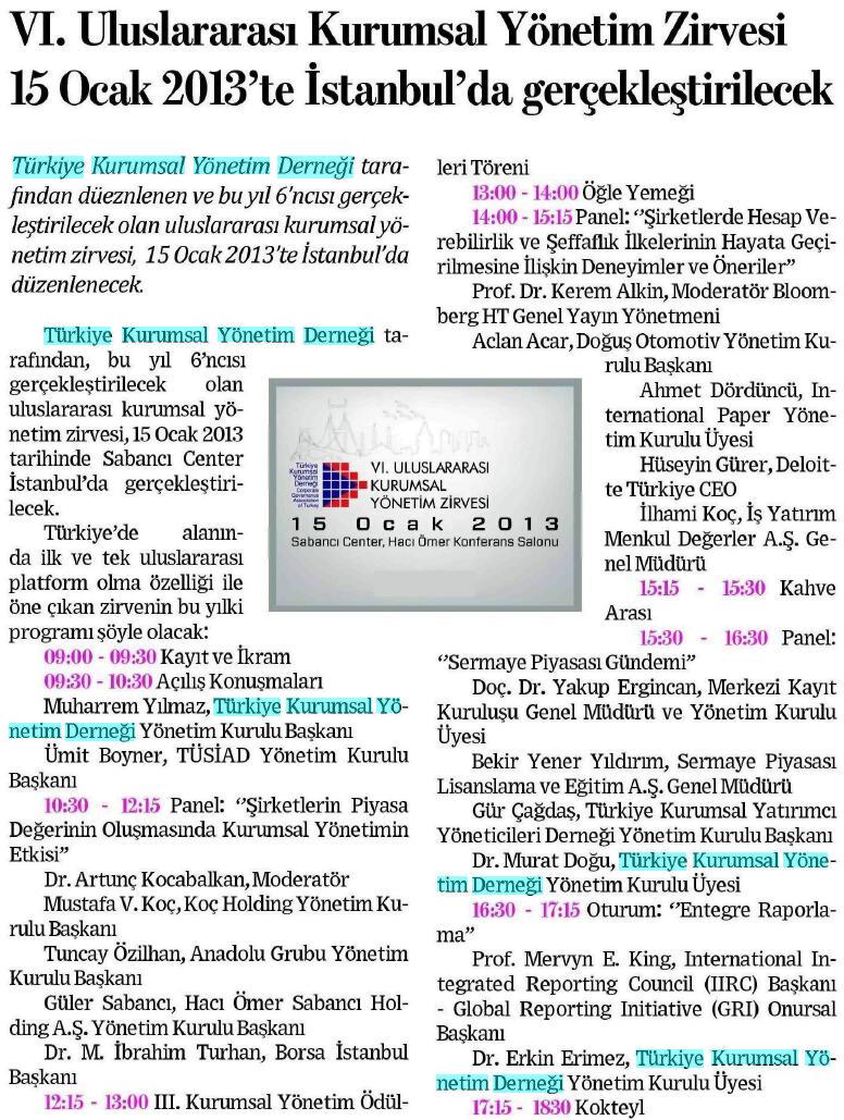 VI. Uluslararası Kurumsal Yönetim Zirvesi | Küresel Ana Haber, 15 Ocak 2013