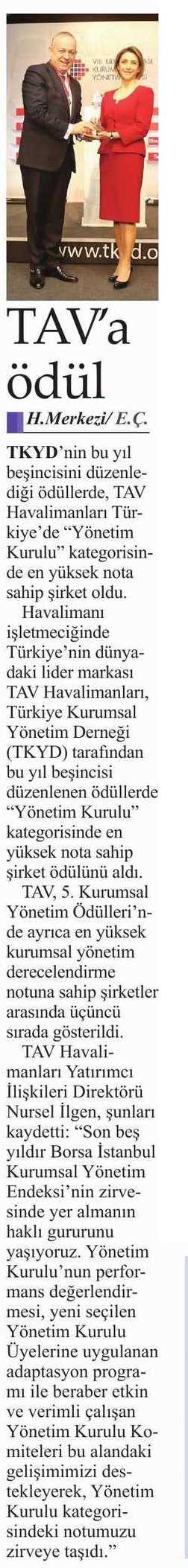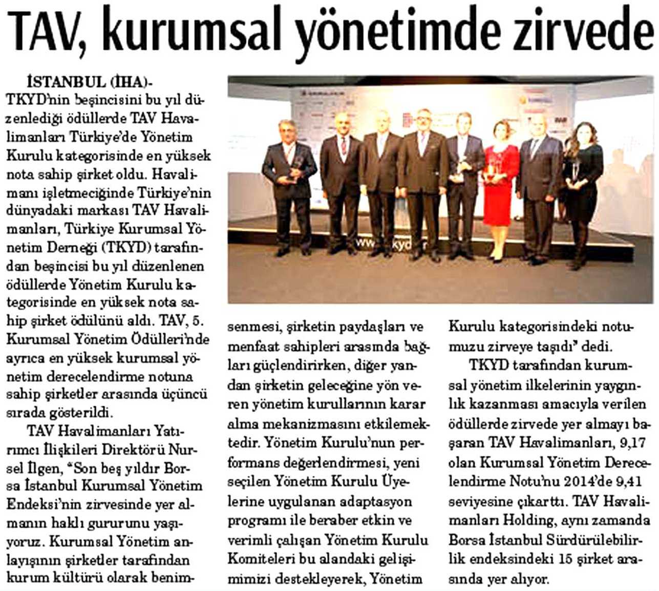 TAV Kurumsal Yönetimde Yine Zirvede Gözlem, 17 Ocak 2015