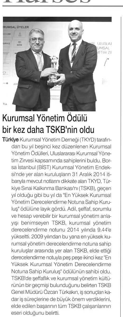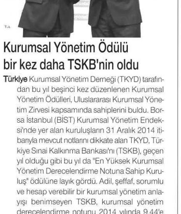 Kurumsal Yönetim Ödülünü TSKB Aldı Sabah, 17 Ocak 2015