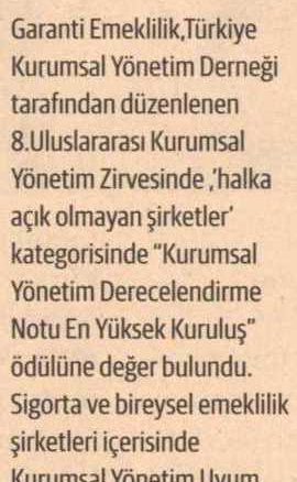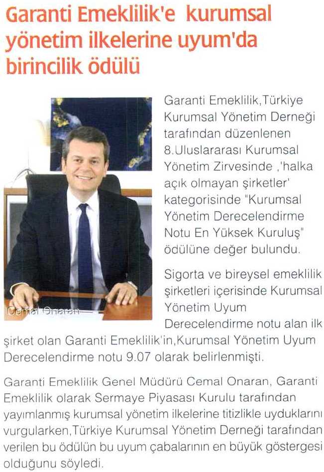 Garanti Emeklilik’e Kurumsal Yönetim İlkelerine Uyum’da Birincilik Ödülü Best, Şubat 2015