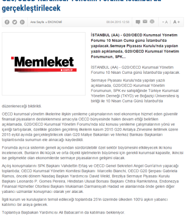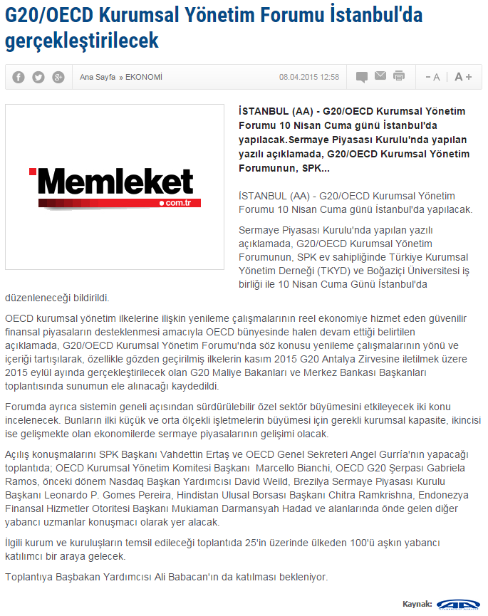 G20/OECD Kurumsal Yönetim Forumu İstanbul’da Gerçekleştirilecek Memleket.com.tr, 8 Nisan 2015